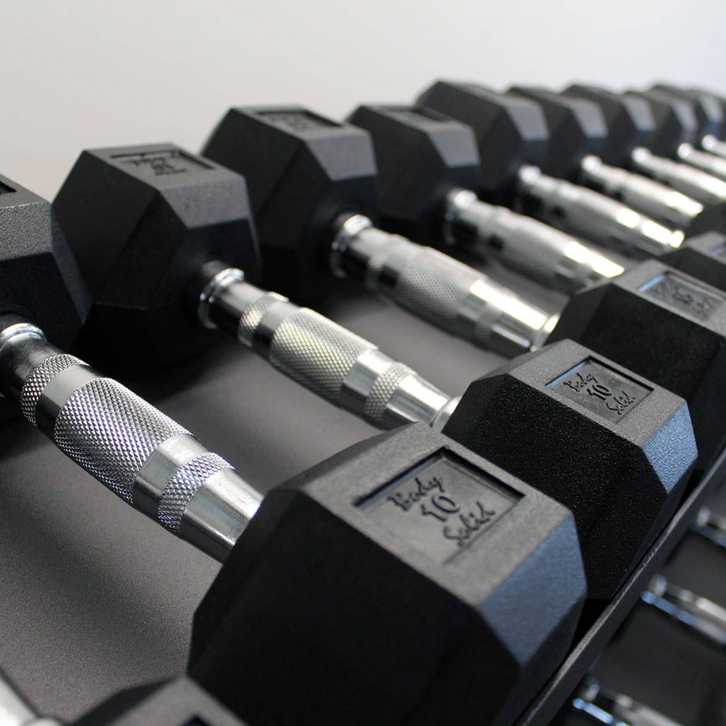 Body-Solid SDR Rubber Coated Dumbbells: Crafted with cast iron and encased in virgin rubber, these hex-design dumbbells are built to last. They resist cracking and fading, plus they protect your floors and other equipment from damage. The machined, chromed handles are welded to the end weights, ensuring superior security and a comfortable grip that cheaper, bolted designs can't match.
