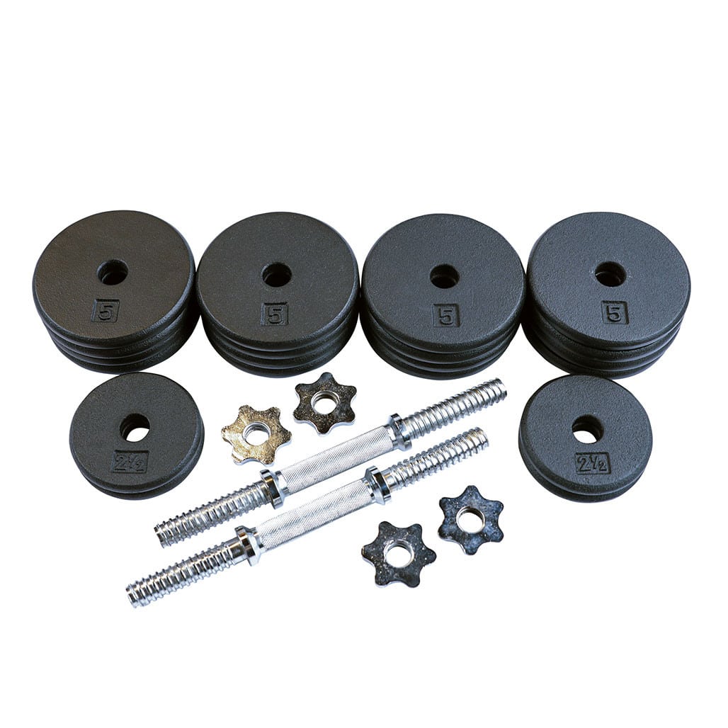 Save space and money with Body-Solid Tools BSTADBPR Adjustable Dumbbells. This pair of adjustable dumbbells offers multiple weight configurations up to 45 lbs. per dumbbell with sixteen five lb. plates, four 2.5 lb. plates, and two knurled dumbbell handles with spin lock collars included in the set.