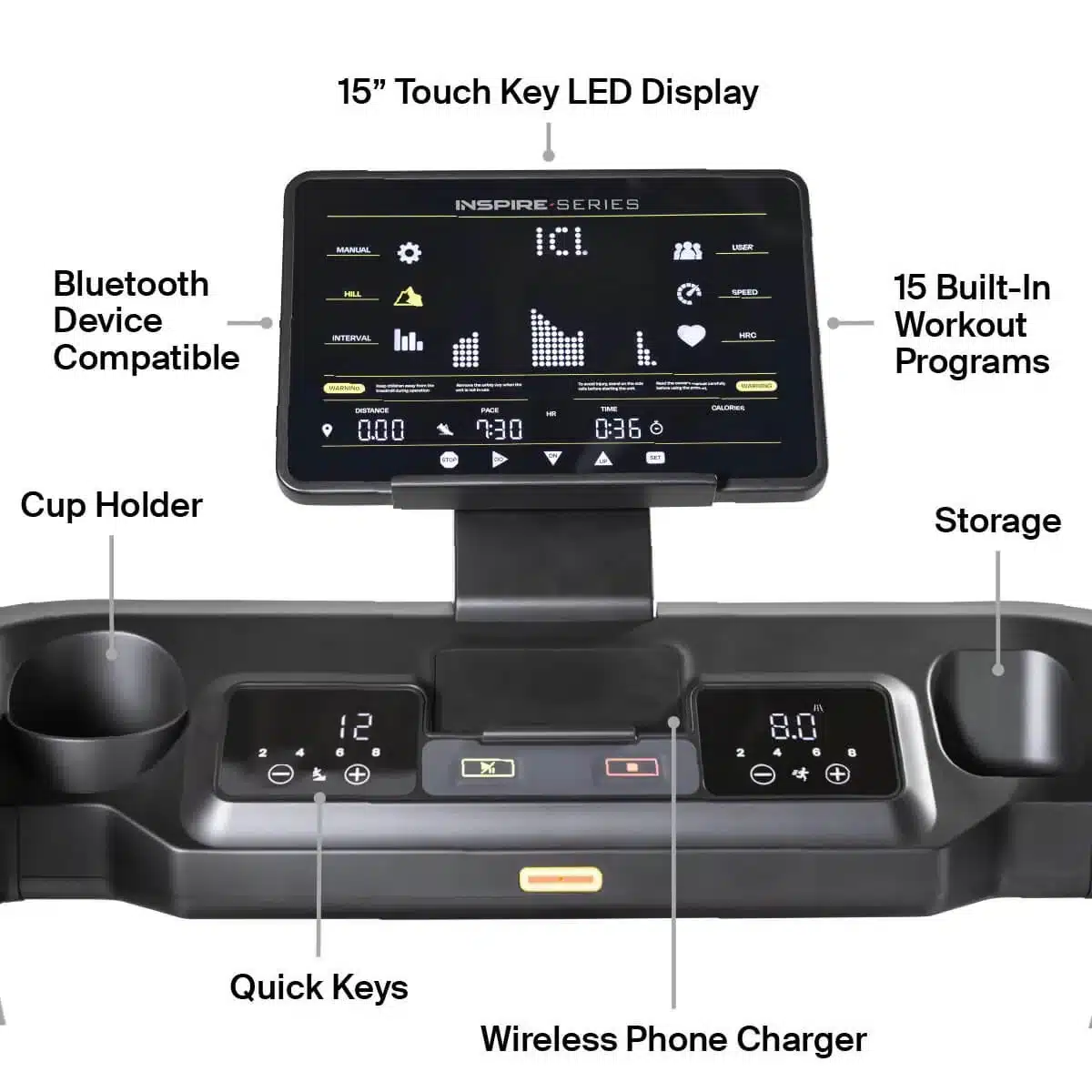 Quickly adjust to speeds of up to 11 mph and an 15% incline with one-touch controls. The 15” touch key LED display includes 15 pre-built programs and accurate workout feedback. Stride with confidence on the all-new Inspire Series T5 Treadmill.