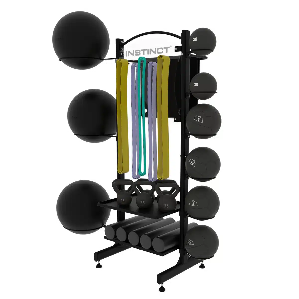 Holds medicine balls, stability balls, rollers, mats, resistance bands, and kettlebells for maximum versatility. -